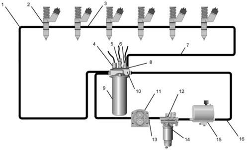 1燃油供给油路,2单体喷油器,3燃油廊 ( 燃油歧管 ),4差压开关 ( 燃油 ),5燃油压力传感器,6燃油温度传感器,7燃油回油油路,8压力调节阀,9细燃油滤清器,10燃油滤座基底部,11燃油输油泵,12电子燃油手油泵,13压力安全阀,14粗燃油滤清器,15燃油箱,16回燃油箱的燃油油路,