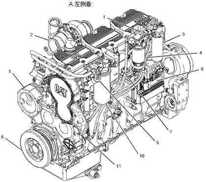 1电子燃油手油泵,2增压器,3燃油细滤清器,4燃油粗滤清器和水分离器,5水泵,6发动机电子控制模块,7发动机机油量油尺,8减振器总成,9发动机机油填加口,10机油滤清器,11燃油输油泵,