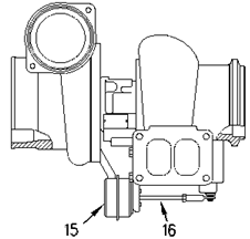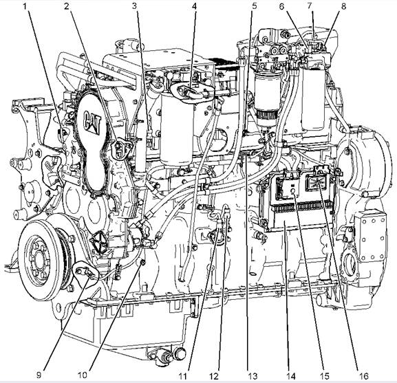 1发动机水温传感器,2第 2 发动机速度/正时传感器,3增压压力传感器,4喷油器气门罩进口连接器,5进气歧管气温传感器,6差压开关 (燃油),7燃油压力传家宝,8燃油温度传感器,9第 1 发动机速度/正时传感器,10正时校正端口,11大气压力传感器,12发动机机油压力传感器,13正时校正探测器连接器,14发动机控制模块,15 J2/P2 ECM 连接器,16 J1 ECM 连接器,