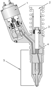 单体泵使用由凸轮轴提供的机械能 去达到可超过 200000 KPa ( 30000 psi ) 的压力.