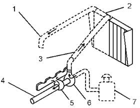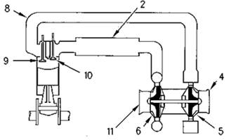 1去发动机的进口,2后冷器芯,3进气气管,4来自增压器的排气出口,5增压器涡轮侧,6增压器压缩叶轮侧,7空气予清器,