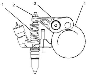 1单体喷油器,2调整螺母,3摇臂总成,4凸轮轴,