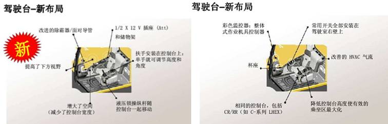 Ø 工作台宽敞、安静而舒适,从而可以确保操作员在一个长时间的工作日内保持高生产率。空调和附件开关很方便地位于右侧壁上,而钥匙开关和油门表位于右侧控制台上。监控器易于观察,尽可能加大了可视范围。