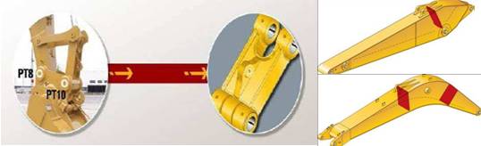 p 铲斗连杆机构。动力连杆提高了耐久性,增强了在关键提升位置的机器提升能力,并且相对于以前的吊耳更易于使用。