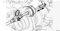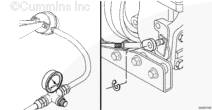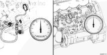 条件 将钥匙开关转到 ON(接通)位置。 使发动机在额定转速下全载运行。 采取措施 测量排气系统背压。 在排气系统中紧靠涡轮增压器下游排气出口的地方安装一个压力表(零件号 ST-1273)以测量排气系统背压。 涡轮增压器出口处测得的最大背压为: 10 kPa (1.5 psi)(不带排气催化器) 15 kPa (2.2 psi)(带排气催化器)。 |